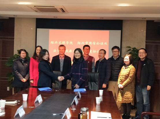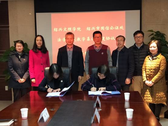 12月14日下午,学院与绍兴市国信公证处签订了共建法学实践教学基地协议书。绍兴市司法局副局长陈兴强、公管处处长陈瑛、国信公证处主任丁筱英、副主任卢小英和学院党委书记郑雨尧、副院长喻文莉、法律系主任屠世超、法律系教师代表等参加了签约仪式。