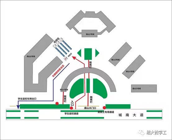 南山校区:统一从正大门东侧进校至篮球场(红色箭头方向行进),接送车辆、陪同人员在同学下车后立即驶离校园(蓝色箭头方向行进)。